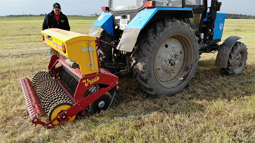 - В первую очередь, это сеялка Vredo для подсева трав в дернину. Благодаря уникальной конструкции и междурядью 7,5 см эта сеялка позволяет быстро восстановить или обновить травяной покров без дополнительной почвообработки. Вы убираете и имеющийся травостой и, одновременно, подрастает новая трава. Одновременное прикатывание увеличивает равномерность всходов и сокращает время прорастания.